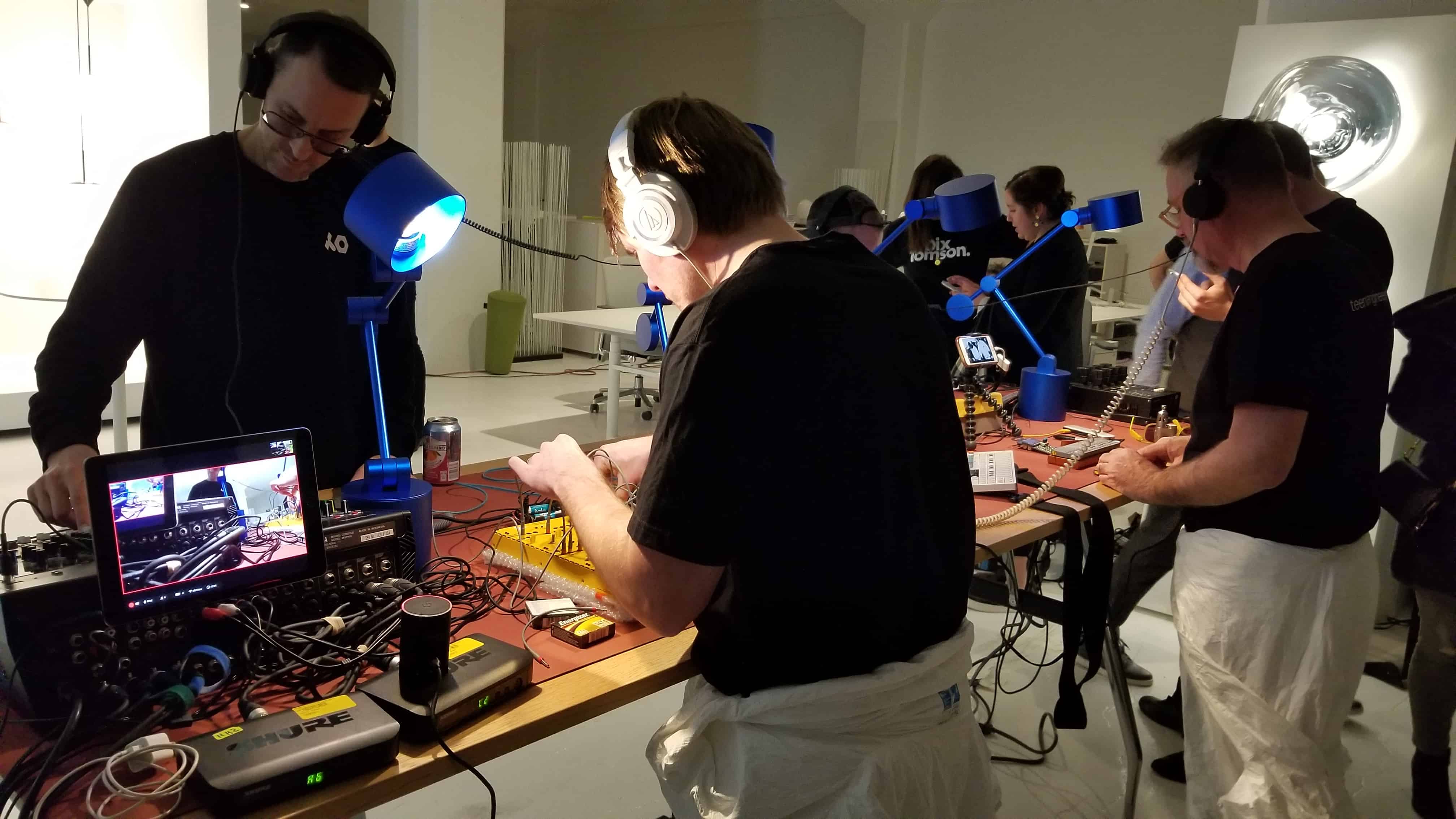In the centre of the multi-level space, the members of Teenage Engineering crowd around soundboards in headphones and waist-cinched white painter’s overalls (looking very Breaking Bad), creating a continuous ambient discord which is bouncing off the concrete walls.