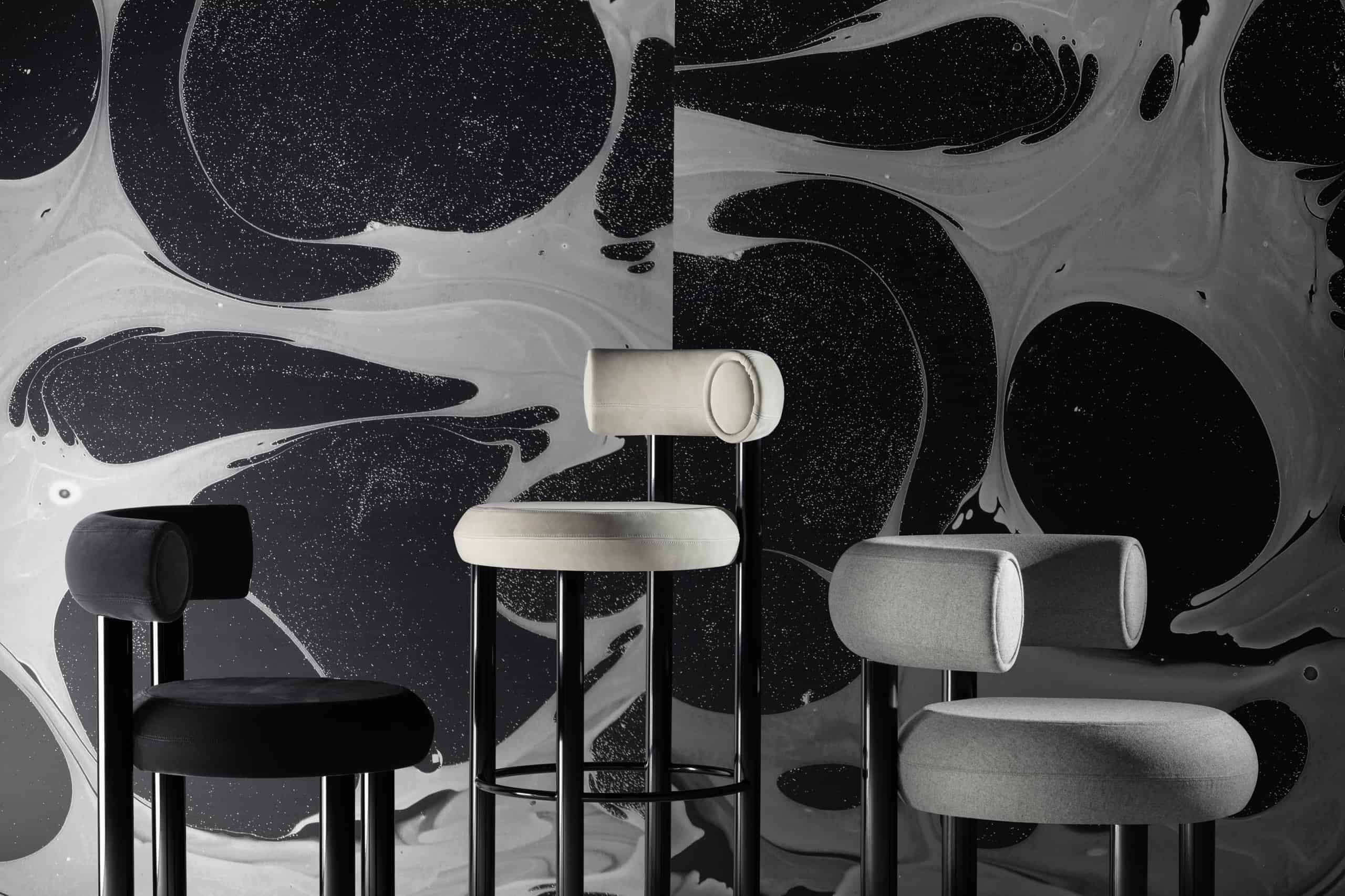 The new upholstery range FAT is designed to hug the body and allows for multiple sitting positions. Available as a dining chair, barstool and lounge chair, the extreme simplicity of the components is a testament to reductionism, while maintaining an instantly recognizable and faintly humorous silhouette. Quite a balancing act. FAT is made from molded foam with metal legs, launching in high gloss black lacquer and made to order upholstery.